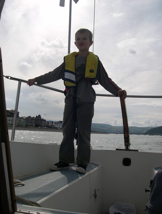 A lovely sunny day with winds of force 3 gave us a wonderful days sail across Caernarfon Bay. Jack has been aboard sailing boats since he was 2 years old and is quite happy as long has he is given something to do. We have a rule aboard that he is always to remain in the cockpit wearing a life jacket, or down below whilst under passage. He has been taught how to hold a compass course and is quite able to handle the tiller in moderate seas. As a 7 year old he has a short attention span and gets bored easily, so short spells on the tiller are interspersed with spells in the galley making sandwiches or programming waypoints into the chart plotter.
